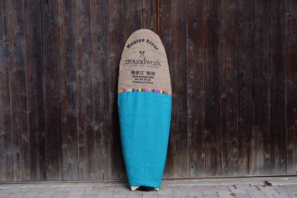 “Fiji” turquoise outer, Manlao River coffee bean sack, teal water/wax resistant liner, blue drawstring rope