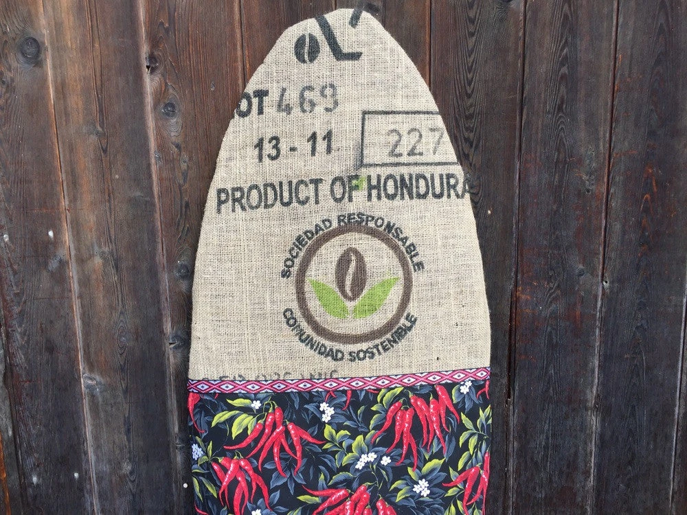 Chili Pepper canvas outer, Peru coffee bean sack, water/wax resistant liner, striped drawstring rope