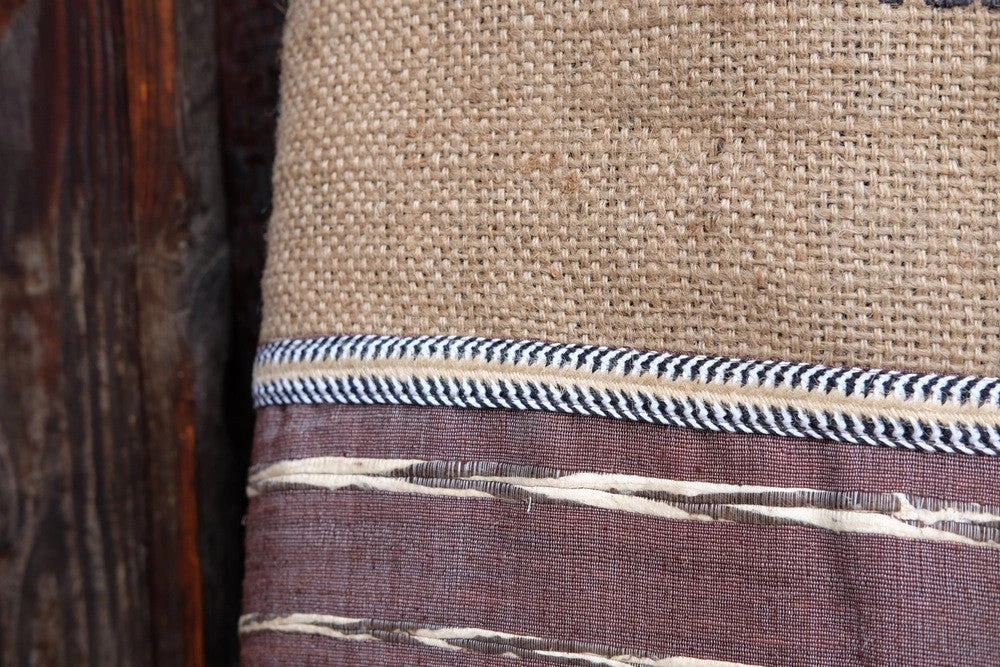 Maroon Stripe woven silk outer, Manlao River coffee bean sack, navy water/wax resistant liner, blue drawstring rope