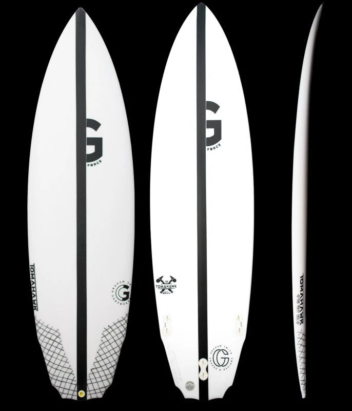 The Tomahawk – Tri-Vent-Hull is a futuristic mix of “Back to the Future” which defines “Turbulent Flow”. This specially designed Hull can have a profound effect on reducing drag caused by friction, and that produces “speed” – having the optimum result we are looking for! The “natural” bottom curve comes with “deep” single concave bottom, and this configuration consists of an inverted Tri-Vent-Hull that runs up from the tail, to the mid-rift of the bottom deck, then blends out into a Vee that’s ends with a micro-bat-tail. This tail configuration gives us instant release when pressure is applied, as these 4-multiple release points reduce drag considerably. The acceleration is astounding, putting looseness under your feet, with control. Making direction change like cutting through butter! The overall straighter outline, enhancers speed, and the noticeable “break” in the rail, gives is more drive and release.